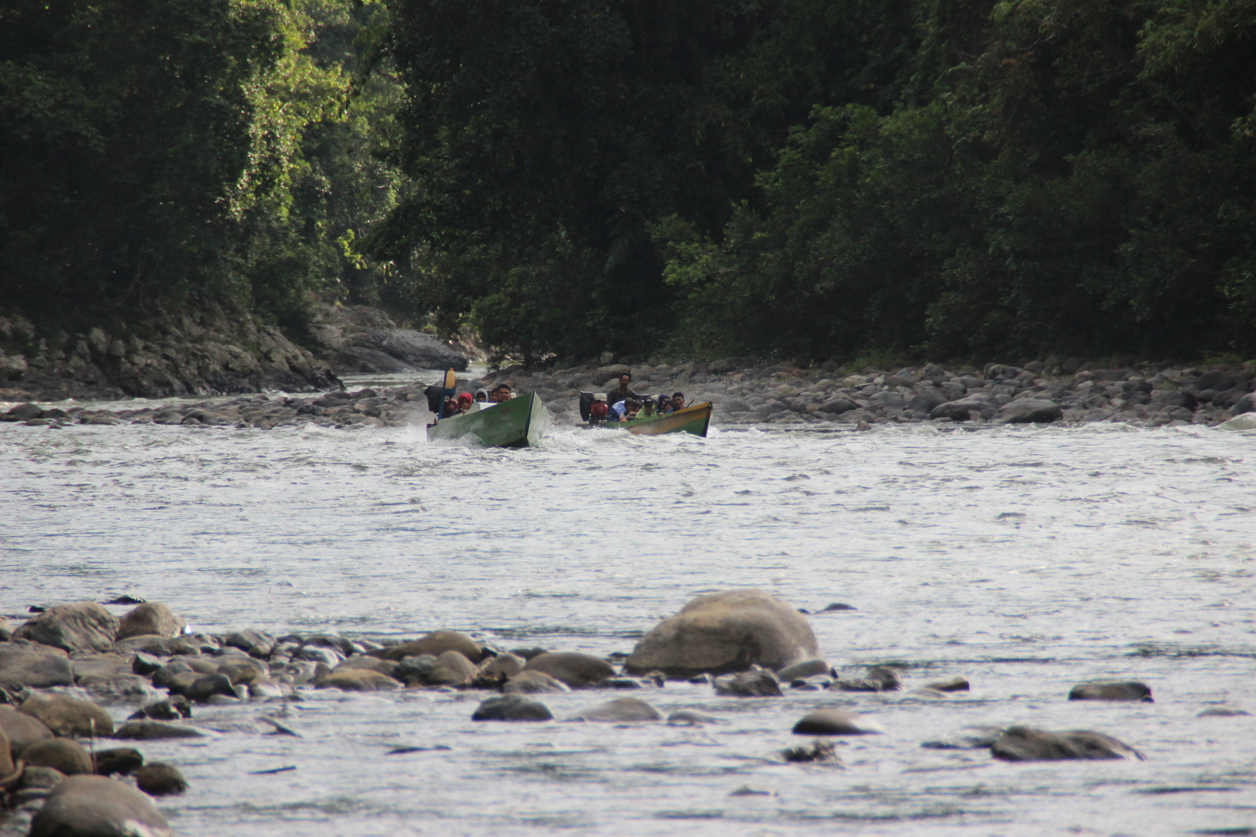 Ketegangan sedikit berkurang, karena kita melalui sungai di antara pegunungan yang rindang, serta udaranya yang segar. Tapi dari empat kalotok yang digunakan relawan salah satunya mengalami masalah.