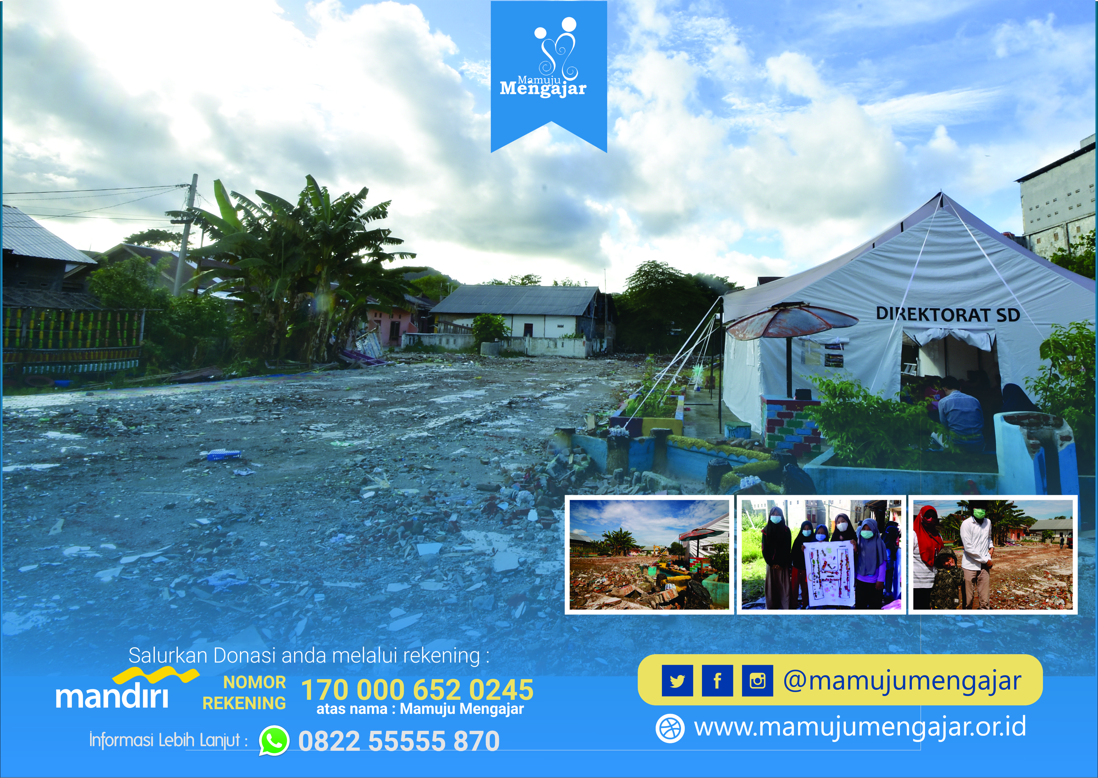 Donasi dapat di transfer ke Rekening Mandiri : 170 000 652 0245 (a.n Mamuju Mengajar)